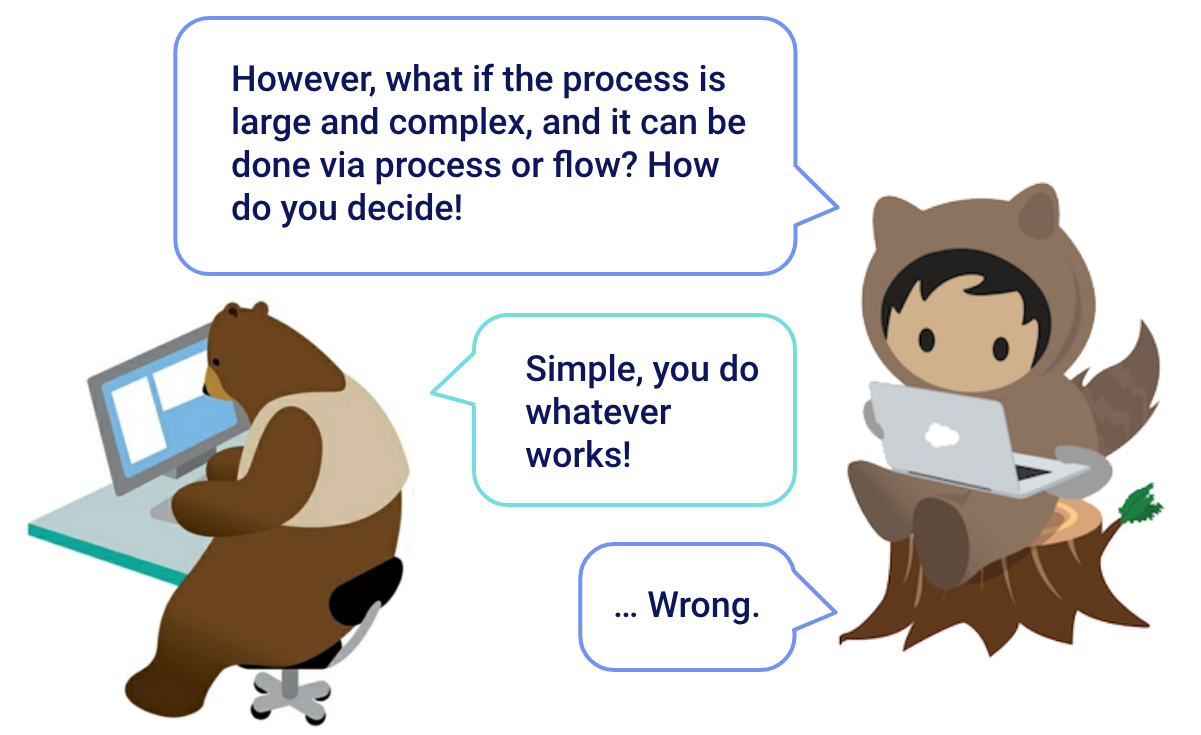 It can be difficult to decide sometimes between flows, processes, triggers, etc. Sometimes you may not even realize it’s the wrong choice until you’re halfway down the implementation path. There is no one-size-fits-all answer for this. There are always exceptions no matter how many rules you follow.