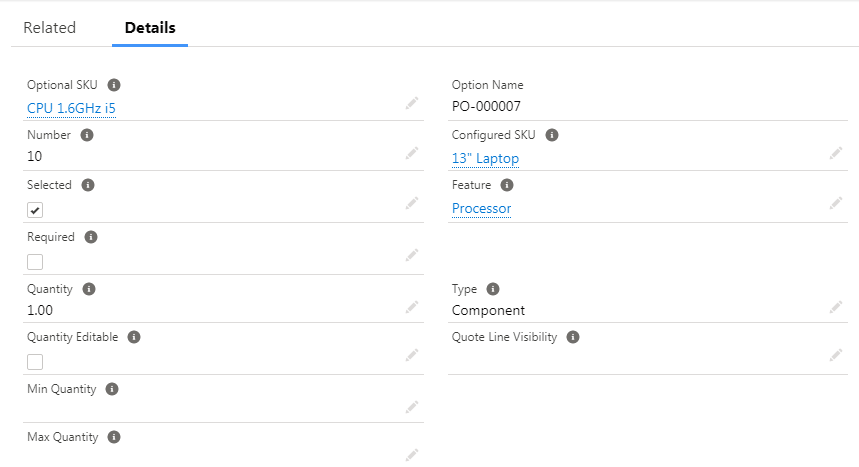 Max Option: It defines a maximum number of this particular product that can be clubbed with Parent Product. E.g. with one Laptop (Parent product) only one processor (sub-product) can be bought.